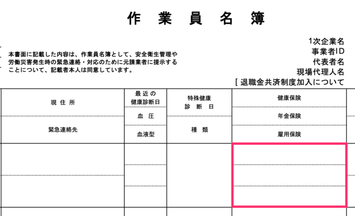全建統一様式第5号の作業員名簿では以下のように記載されています。