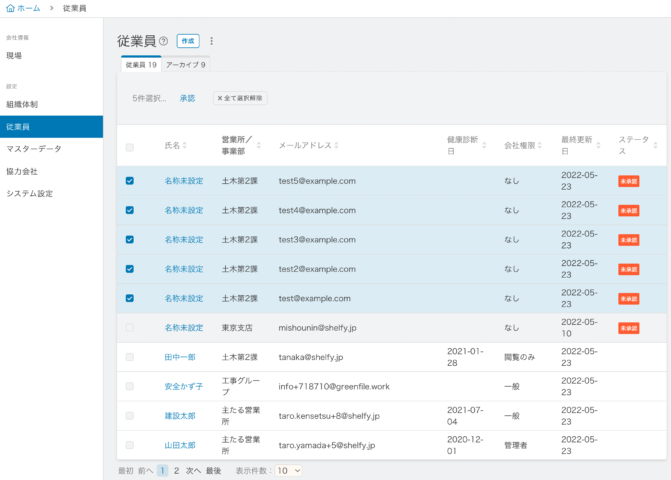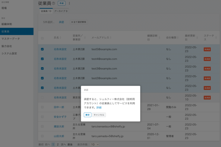 ※承認済みと未承認従業員を混合で選択することは可能ですが、未承認に対してはデータの一括操作は行われません。まずは承認をしていただき、その後に一括操作をお願いします。