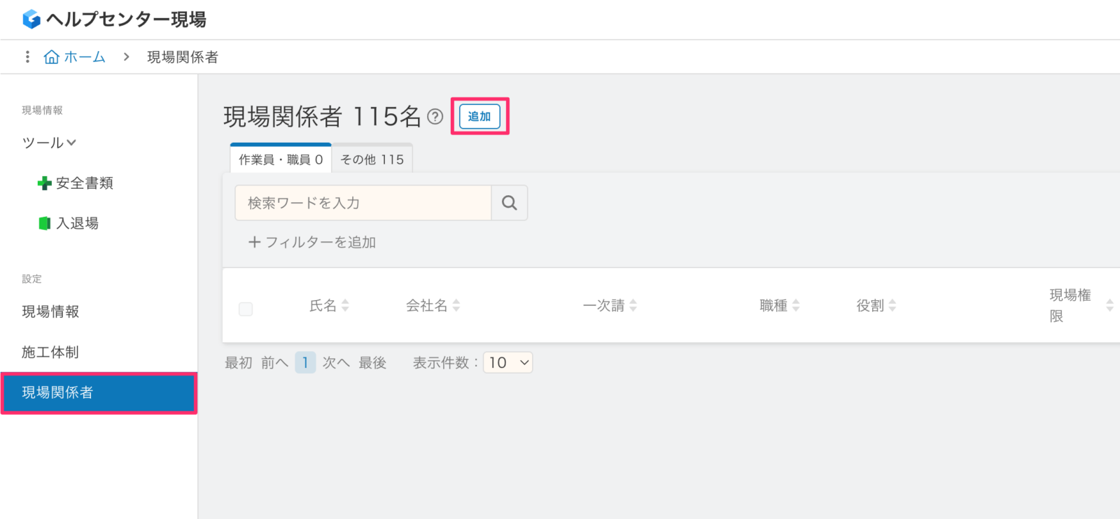 現場関係者内の追加ボタンを押しても現場関係者の招待はできません。