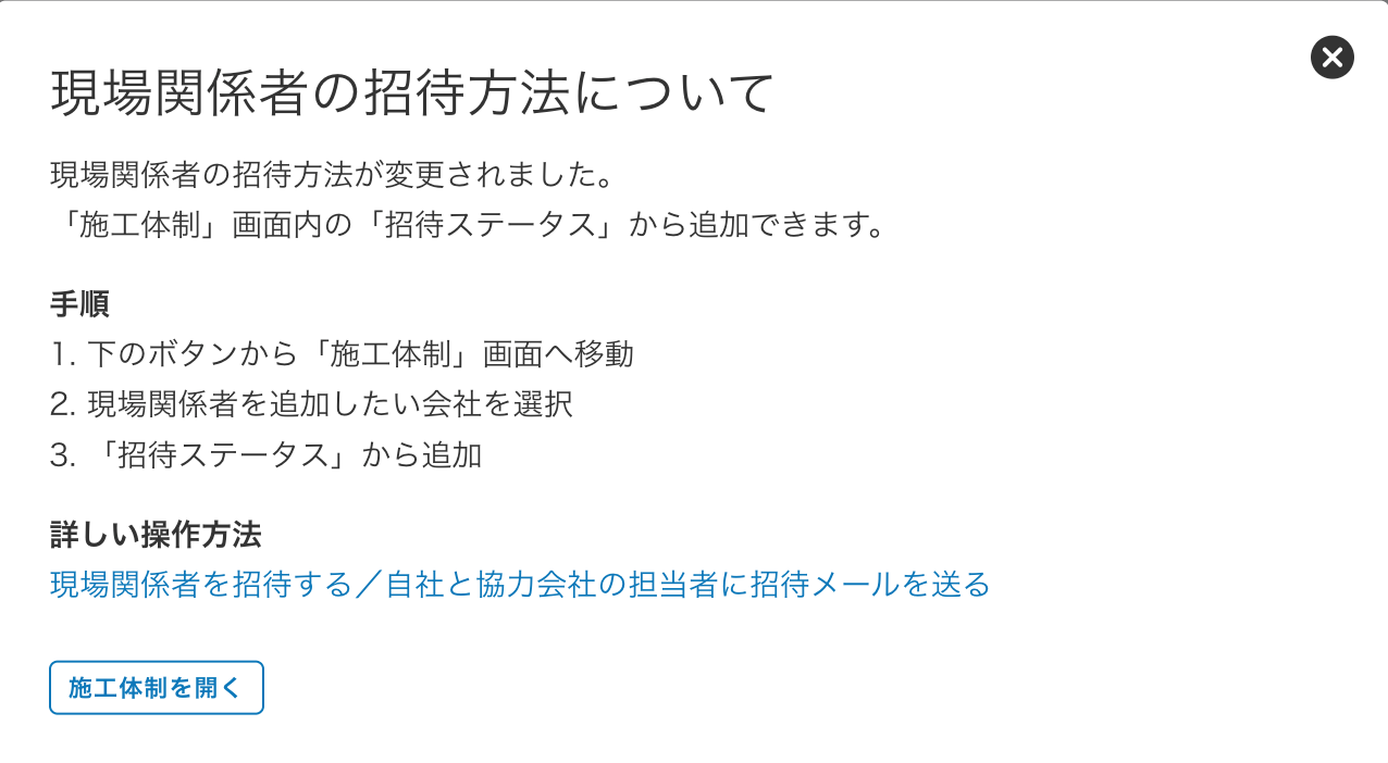 この度、サービスの利便性向上を目的として、現場関係者の招待方法の見直しを行ないましたので、以下のとおりご案内します。