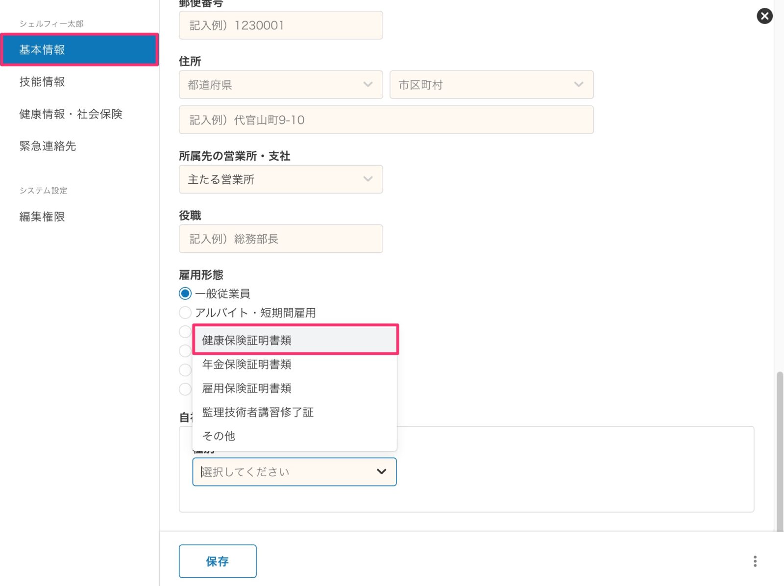 「自社従業員である証明書類」の種別の選択肢に「健康保険証」が表示されます。