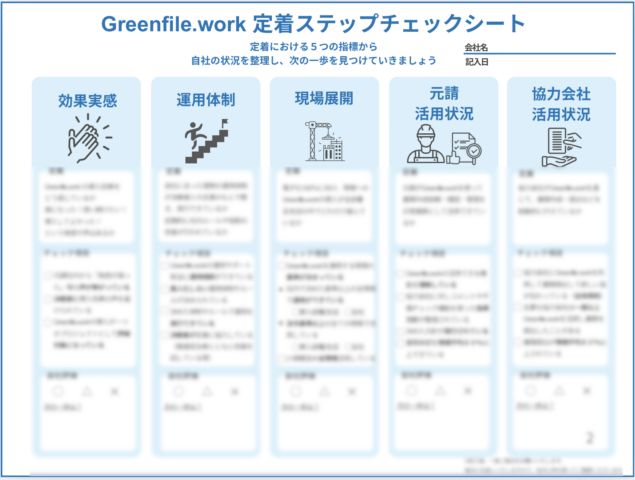 Greenfile.workでは、数多くの元請様に導入いただき、運用をサポートしていくなかで、定着を測る指標として5つの軸があると分かってまいりました。