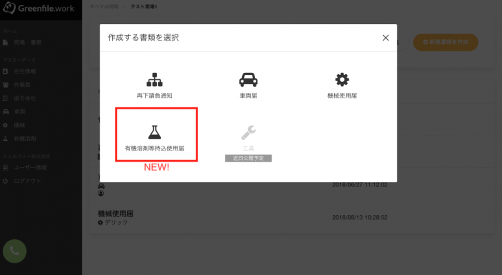 「現場・書類一覧」から各現場をクリック→「新規書類を作成」より機械使用届を選んでいただけるようになりました!